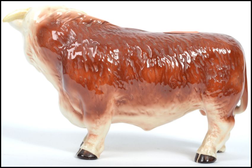 A vintage 20th century large Melba Ware ceramic figurine of a Hereford Bull being stamped to the base. Measures 15 cm high, 26 cm wide and 13 cm deep.