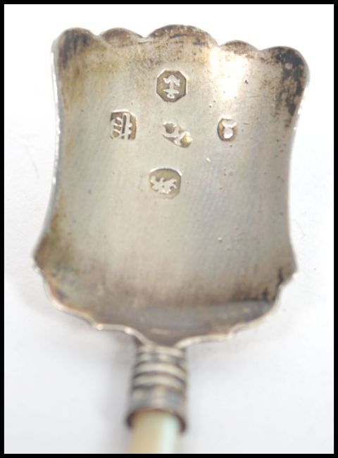 A 19th century Georgian silver hallmarked salt / snuff scoop having a tapered mother of pearl handle. Hallmarked for Birmingham 1827 makers believed James Collins Measures 9.5 cms long and weighs 3.9 grams.
