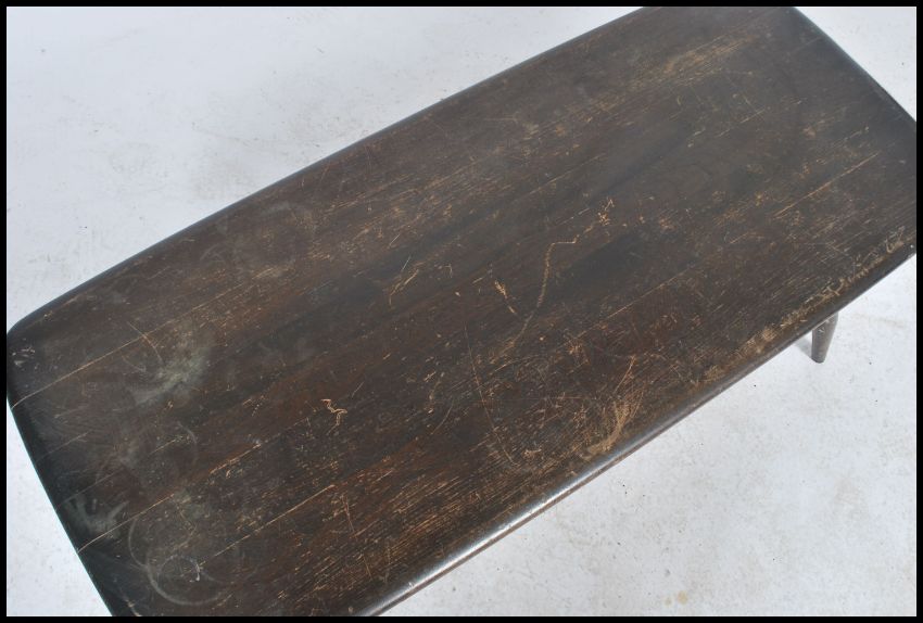 A vintage retro 20th century Ercol gold label low coffee table having a rail bottom raised on tapering legs with panel top. Measures: 36cm high x 105cm wide x 45cm deep.