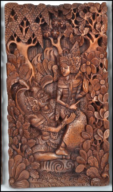 A collection of 3 20th century Indonesian / Thai hardwood carved panels in relief having scenes of people, animals and forestry. Measures 49 cm high and 26 cm wide.