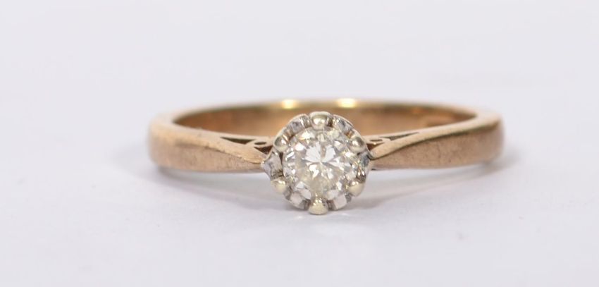 A hallmarked 9ct gold diamond solitaire ring set with a single round cut diamond in a prong setting Hallmarked Birmingham. Diamond approx 20pts. Total weight 2.7g . Size M.