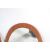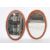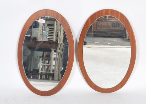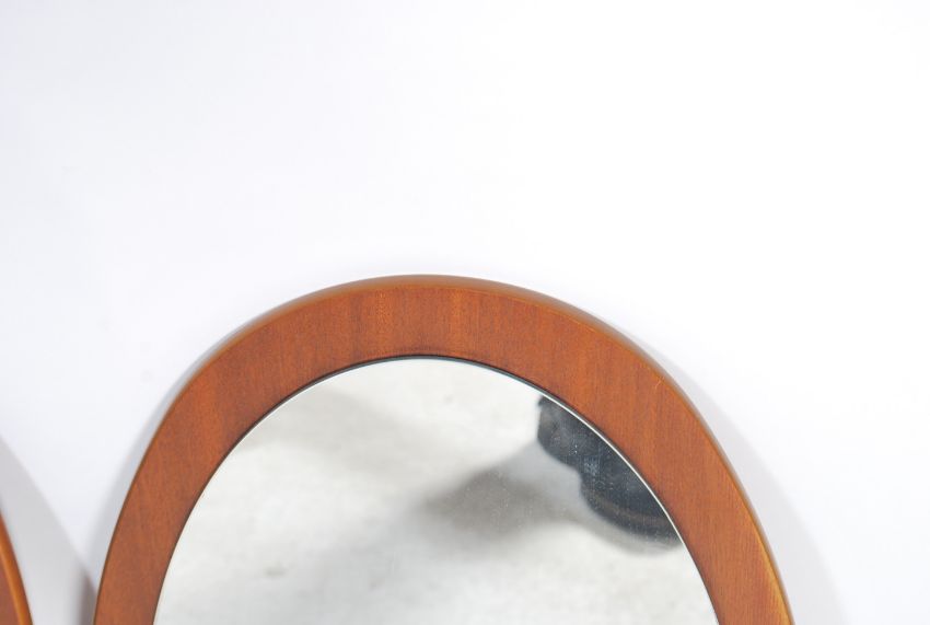 A pair of vintage mid 20th century Danish influence retro frame less circular wall mirrors mounted on teak wood backs.