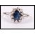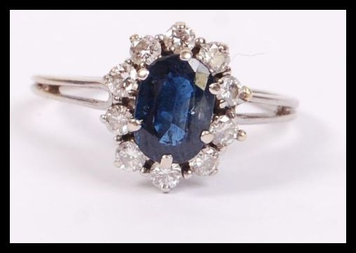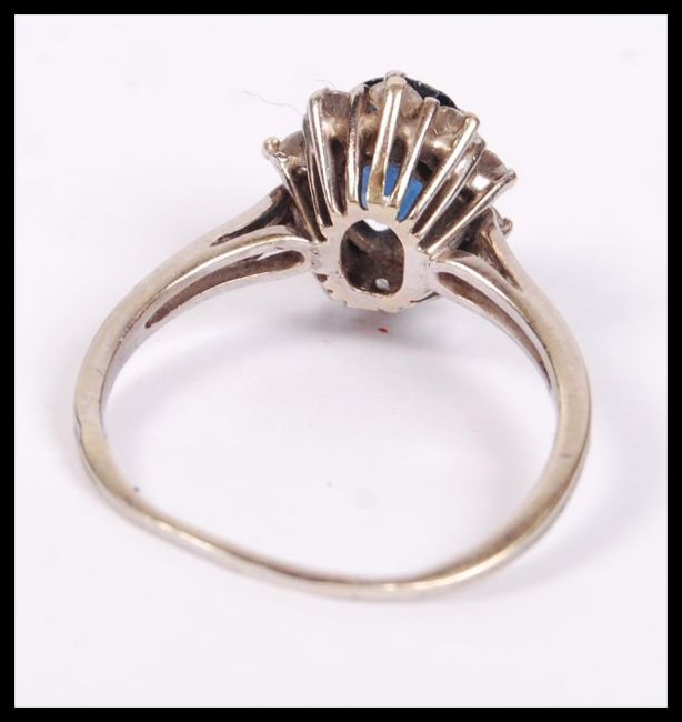 A white gold sapphire and diamond ring having a central sapphire adorned with a halo of diamonds, weighs 4.4 grams size T.