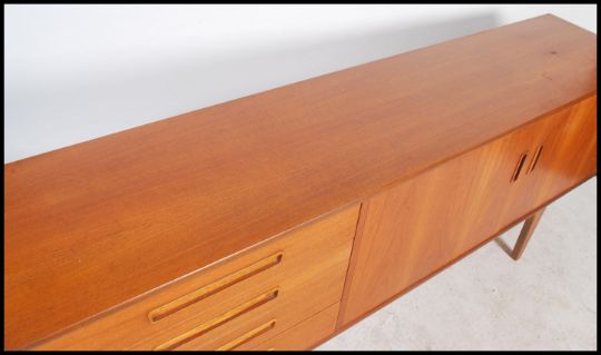 A good mid century Danish manner sideboard - dresser being raised on tapering legs with a series of cupboards flanking a bank of drawers, all with recessed lozenge shaped handles. Measures: 80cm high x 198cm wide x 43 deep.