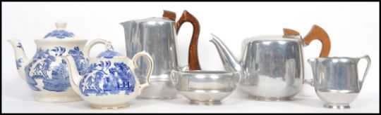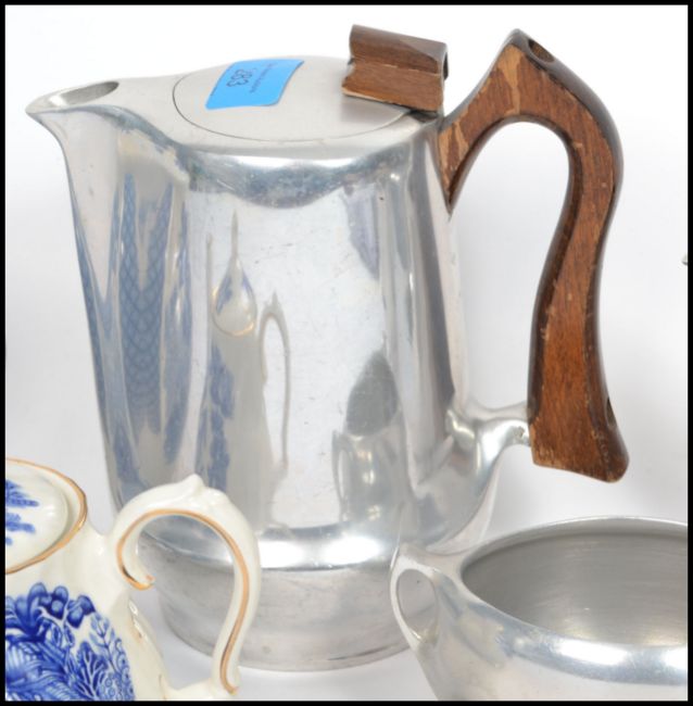 A retro 20th century Piquot Ware tea and coffee set consisting of teapot, coffee pot, creamer and sugar bowl. Measurements: 18.5 cm highest, 23 cm widest and 14 cm deepest.