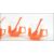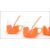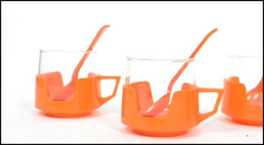 A set of six vintage retro 20th century JAJ Pyrex cups and spoons in Volkswagen orange having stamps to base. Measures 7 cm high, 10 cm wide and 8 cm deep.