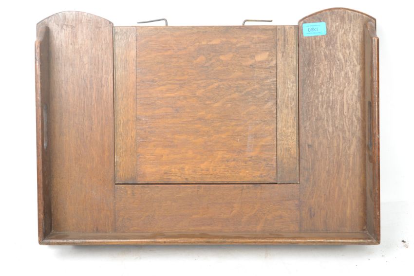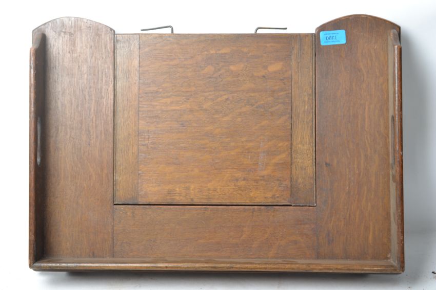 A 1930's Edwardian oak metamorphic bed tray / lectern having drop down fold out legs.