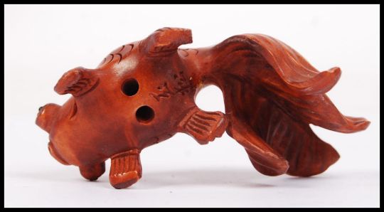 An oriental carved wooden netsuke in the form of a carp fish with large bulging eyes.