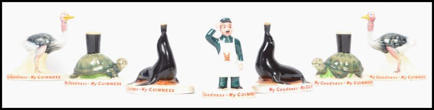 A collection of seven original 1950's Carlton Ware ceramic hand painted figures to include Seal x 2, Zoo Keeper, Turtle x 2  and Ostrich. All stamped to the underside. From a large private collection of Guinness memorabilia collected by the vendors father who worked for Guinness from the 1950's till the 1980's. x 2. Measures: 10cm high x 11cm deep x 8cm wide.