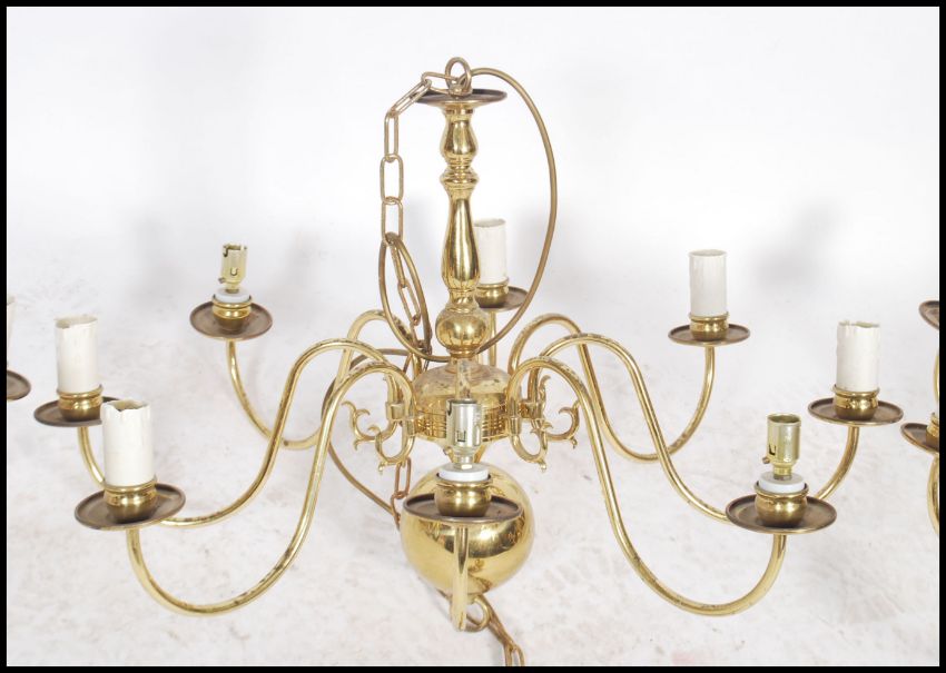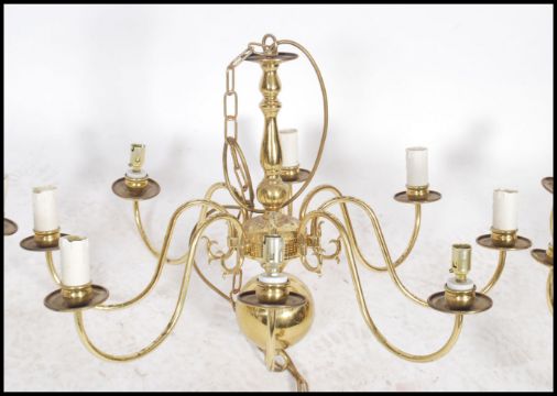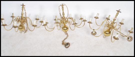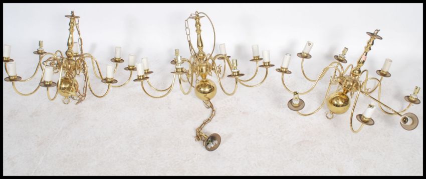 A set of 3 20th century antique style polished brass chandeliers, each with ball finials having multiple scroll arms and sconces