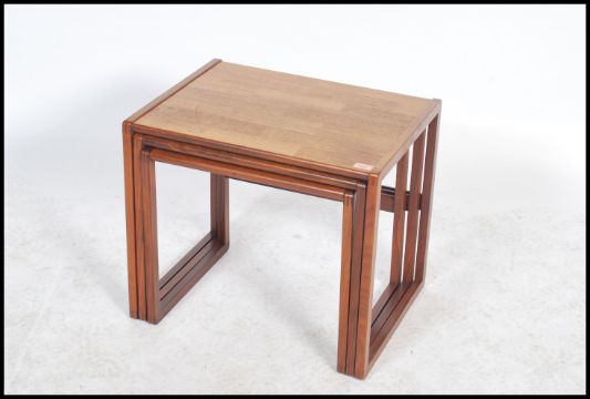 A good set of believed Danish retro teak wood 1970's graduating nest of tables. The tables having angular legs united by reverse stretchers with graduating table tops above. Measures: 48cm high x 56cm wide x 43cm deep.