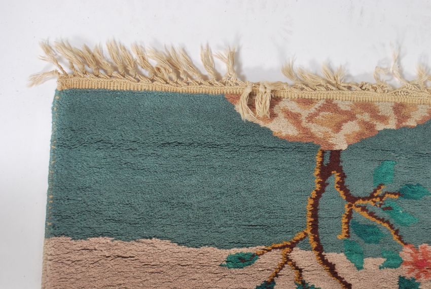 A 20th century Persian Islamic carpet rug of unusual form depicting the tree of life on a sky ground with decorative spandrel borders. Measures 226 cm x 122