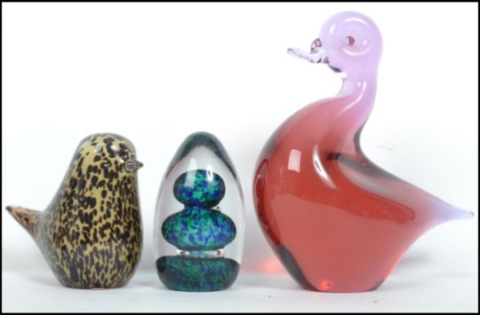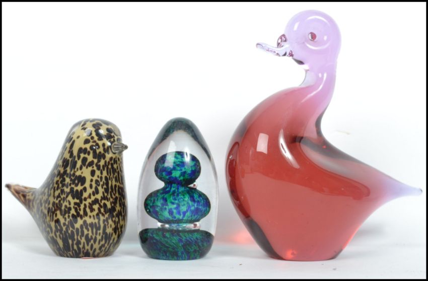 A collection of eight Wedgwood studio glass paperweights to include a cranberry glass Elephant, a clear glass Elephant, Squirrel, birds etc. highest measures 18 cm.