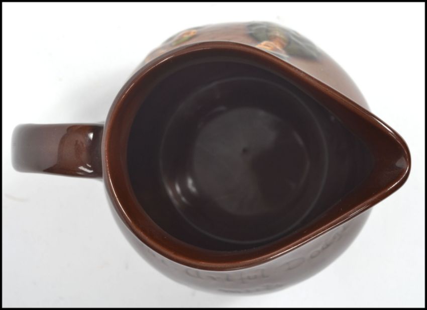 A Royal Doulton Kingsware Jug, "THE ARTFUL DODGER MEETS OLIVER TWIST" showing the Artful Dodger and Oliver in relief. Satmped to the base. Measurements:  14 cm high, 11 cm wide and 17 cm deep.