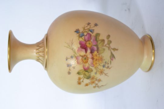 A Royal Worcester ivory blush ceramic vase of globular form having painted floral spays with waisted neck and flared rim. Puce factory marks to base.