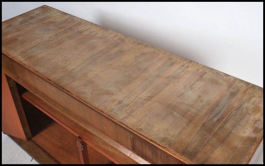 A mid century  helix pattern sideboard possible by David Booth and Judith Ledeboer for Gordon Russell. The sideboard raised on plinth with stub feet having short drawers over cupboards with knob handles.  72 cm high x 141 cm wide x 50cm deep