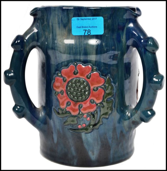 An Elton ware three handled loving jug having tube lined flowers in strawberry colourway with a blue and purple ground, three spouts to the rim and prunted handles. repair to rim.  Measurements: 20 cm high, 19 cm wide and 19 cm deep.