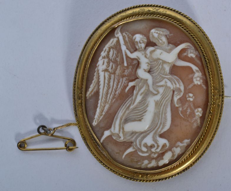A 19th century shell cameo brooch depicting scenes of cherubs and goddess set in a yellow metal mount with pin to verso.