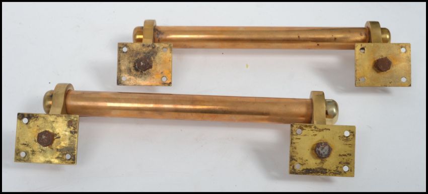 A good pair of 20th century brass vintage Art Deco cinema door handles of column form having affixed back plates. Measures 30 cm long.