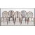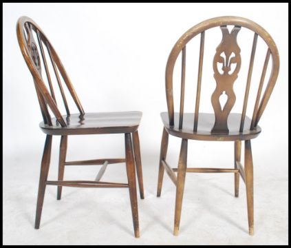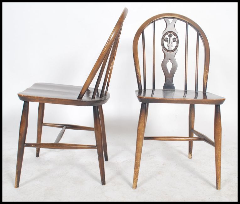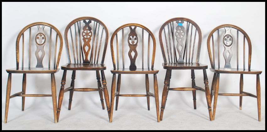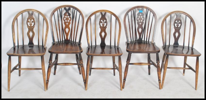 A set of 4 20th century country oak wheelback dining chairs being raised on turned legs united by stretchers having saddle seats with wheel back rests. Measures 88cms high