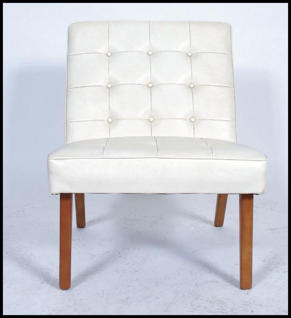 A vintage retro 20th century Mies Van De Roe inspired white cream button back chair raised on shaped beech legs. Measures: 71cm high x 59cm wide x 71cm deep.