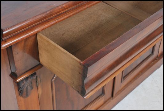 A Victorian style flame mahogany chiffonier sideboard being raised on a plinth base with short drawers over cupboards beneath