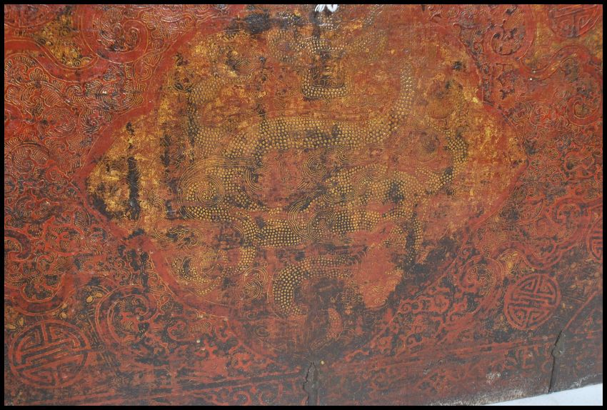 A good late 19th century Tibetan wooden marriage  trunk / chest coffer having applied decorated canvas design of colourful form with hinged top above. The chest has a hinged top on cast metal bale and loop design. Measures: 66cm high x 140cm wide x 53cm deep.