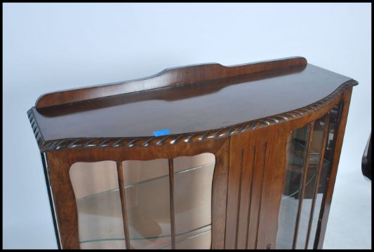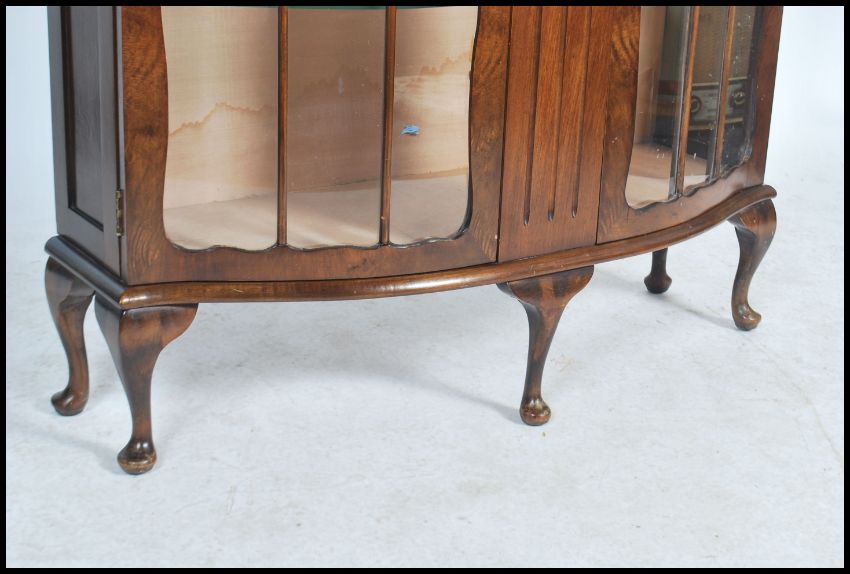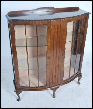 An Edwardian oak twin door display cabinet, fitted with adjustable heightshelves raised on. Measures 121cms by 101cms by 35cms.