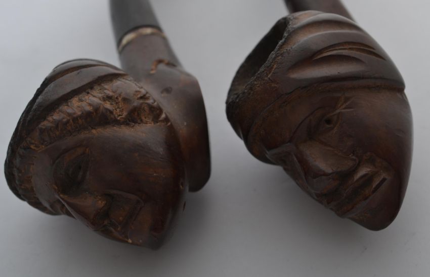 Two early 20th century briar wood pipes having ebonised horn mouthpieces with detailed carved Moorish faces.