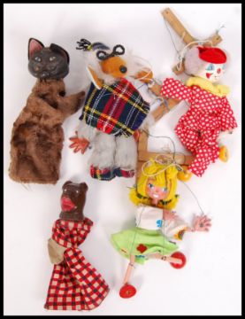 A collection of 5x vintage string & hand toy puppets to include; The Wombles' 'Uncle Bulgaria', cat, clown, young lady & bear.