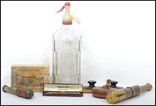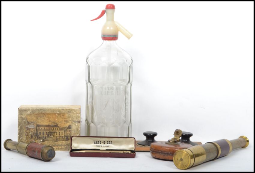 A collection of items to include a  vintage pocket brass telescope, another marked Telford Chester, a Rabones Metallic wired tape etc. Bottle measures 32 cm high.