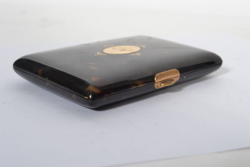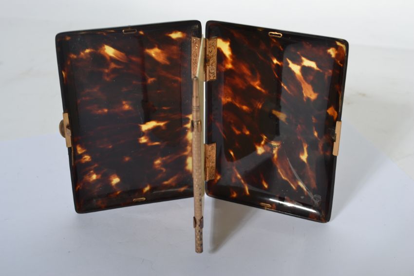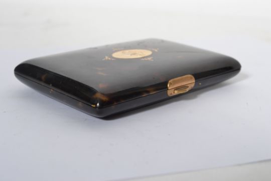 A 19th century tortoise shell aide de memoir with gold inset lozenge with monogram to centre having a button lock with hinged lid opening to a reveal a bone note sheaf with gold pencil.