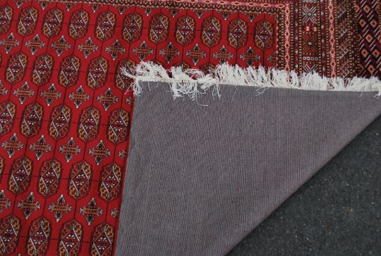 A large Iranian / Persian Bokhara carpet - rug having red ground with geometric decoration and borders. Measures 1.90 x 1.40 m