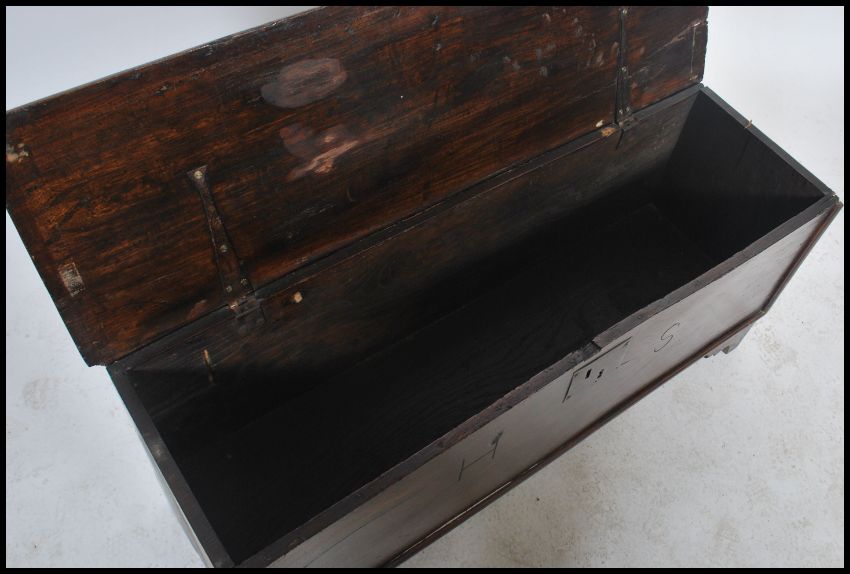 An 18th century joined elm country coffer chest having a wide carved panelled front being raised on shaped pierced end panel supports. Measures: 49cm high x 114cm wide x 36cm deep.