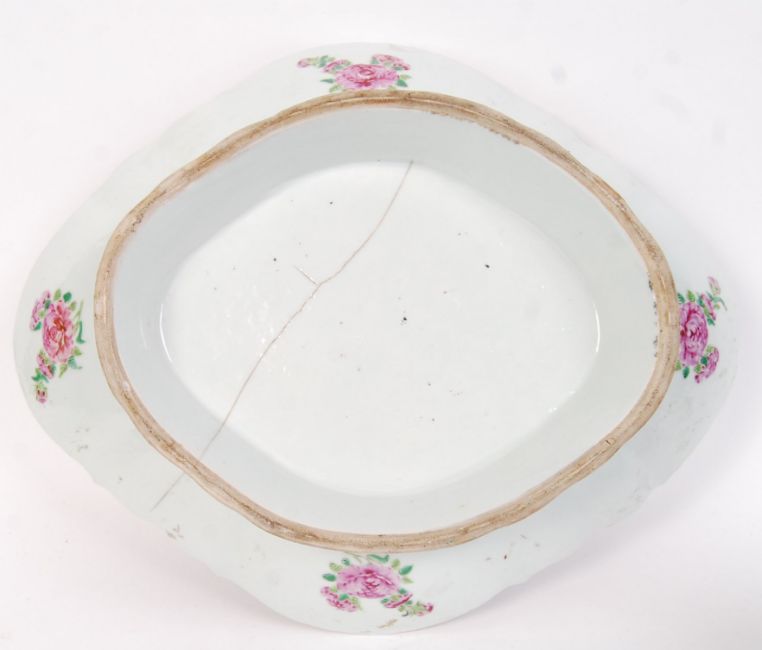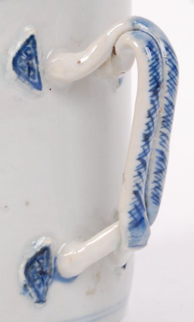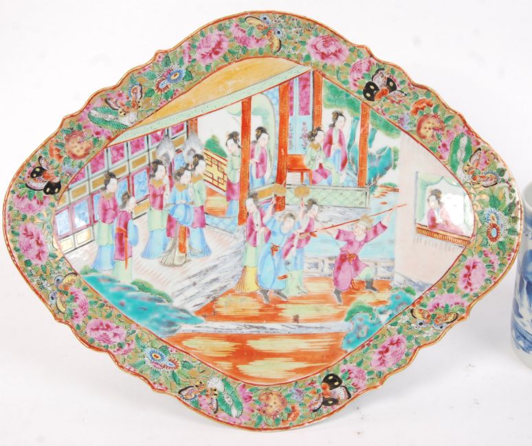 An antique 19th century Chinese Cantonese famille rose hand painted diamond shaped dish, featuring a traditional oriental geisha scene (a.f.). Along with a good 19th century blue and white Chinese tankard, also depicting a traditional oriental landscape.