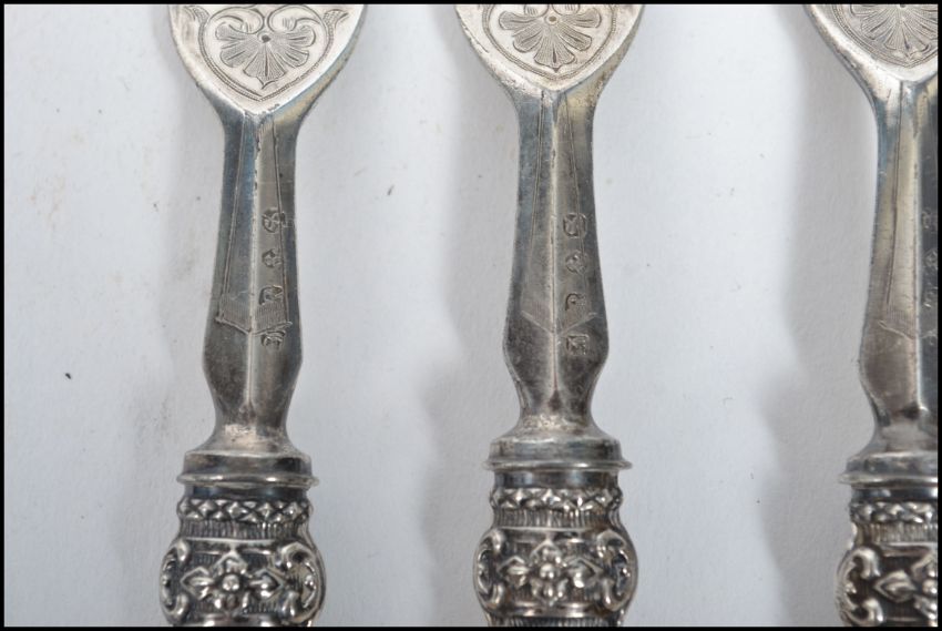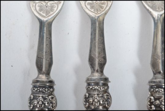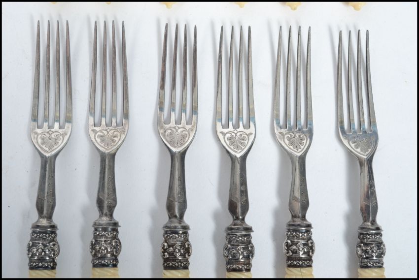 A set of six 19th century ivory handled knives and forks having silver collars having Dieppe influenced carved handles.