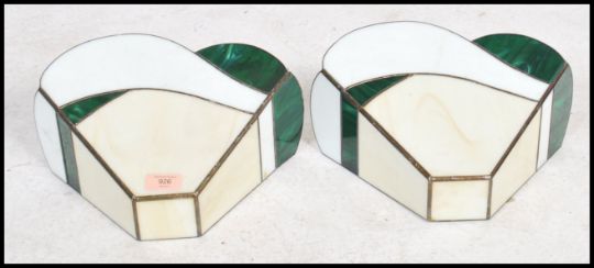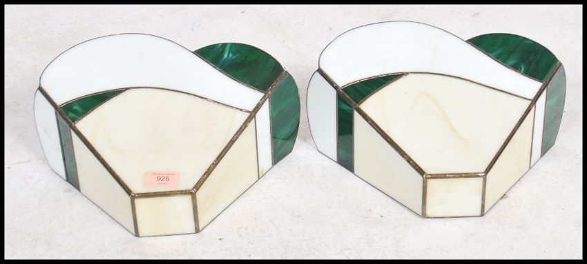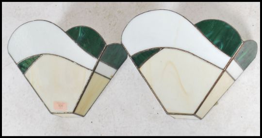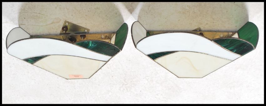 A pair of fluted stained and leaded, coloured glass wall sconce light fitment shades. Of wonderful colour and shape having brackets for mounting verso ( see images )