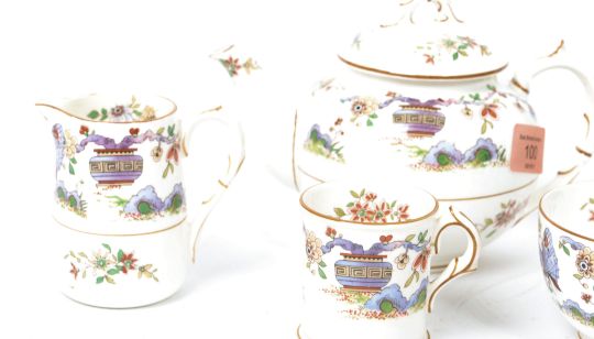 An early 20th century Royal Worcester tea service in the Pekin pattern consisting of teapot, tea cup , coffee can, mug and creamer. Stamped to base. 9757.