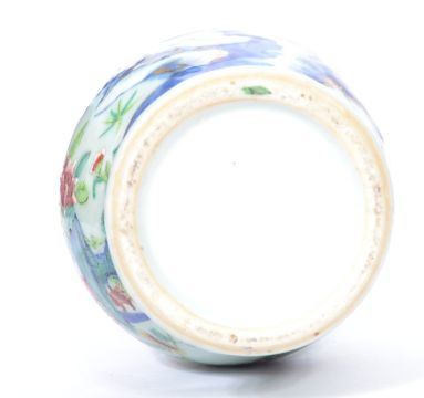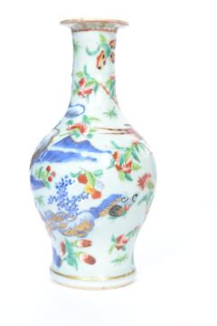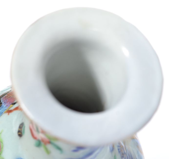 A late 19th century circa 1880 Oriental Chinese ceramic vase having a globular body with waisted neck and flared rim, the body decorated with foliage birds and butterflies. Measures 23cms high.