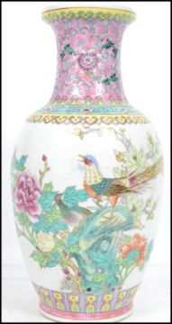 An Oriental Chinese ceramic vase having a white ground decorated with famille rose birds and flowers and a pink floral decorated waisted neck, character marks to base. Measures 36 cm high and 19 cm diameter.