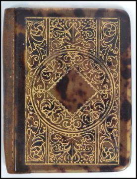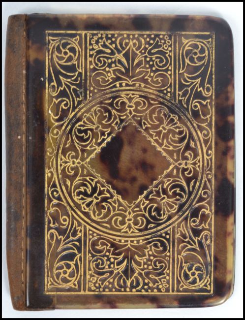 A group of tortoise shell wares to include an aid de memoir with gilt detailing, a hair clip and an eye piece of circular form along with a tortoise shell type pot with mirror lid. Aid de memoir measures 8 cm long and 6 cm wide.