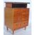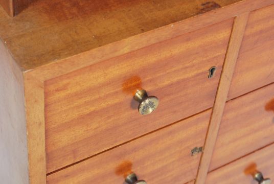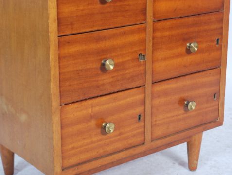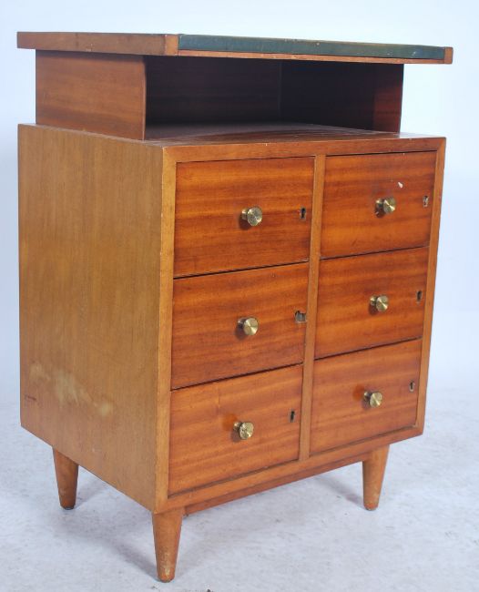 An unusual early 20th century Industrial office filing index cabinet raised on tapering legs having a bank of drawers beneath a suspended leather tooled writing top