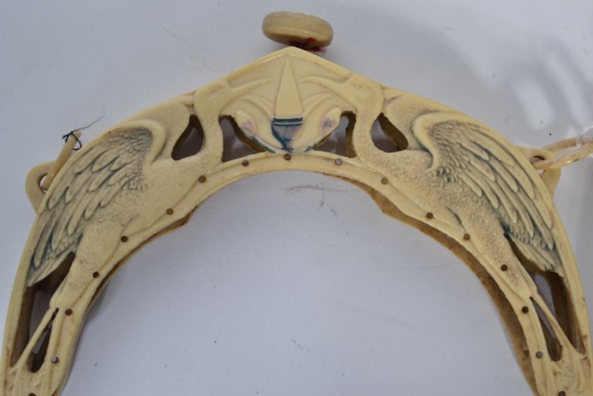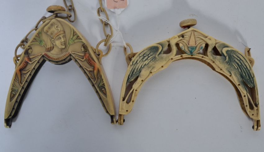 Two Art Deco celluloid ladies hand bag tops, one with Storks and the other with Egyptian characters