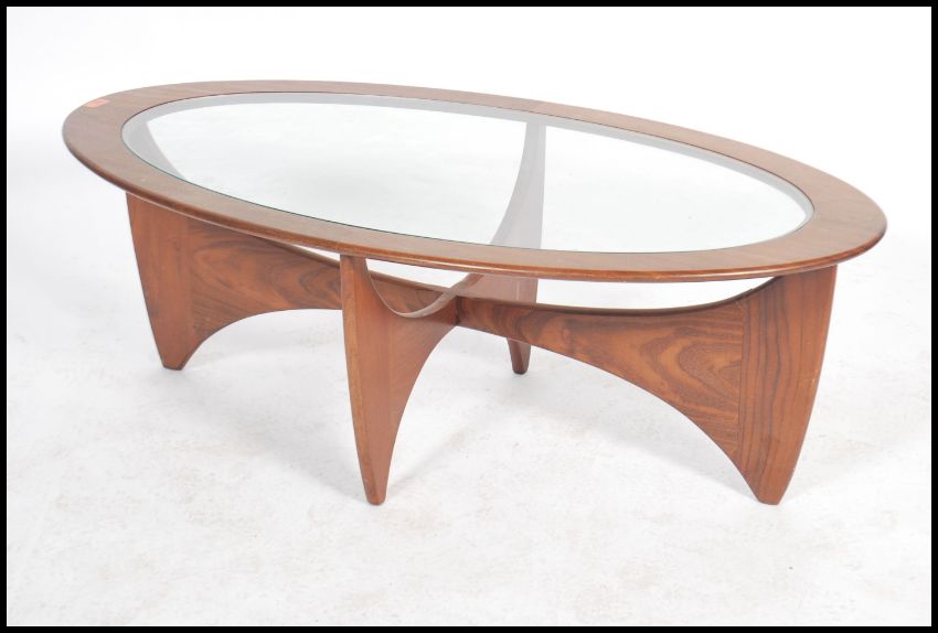 A retro teak wood atomic 'Astro' oval coffee table by G Plan, having a drop centre glass panel, the teak frame supporting the oval glass surface. Measures: 42cm x 122cm x 66cm.