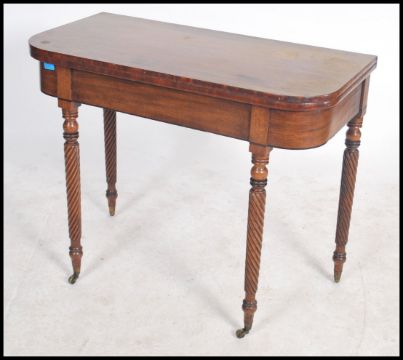 A 19th century Regency revival mahogany tea table / games card table being raised on turned legs with fitted frieze and flip over top