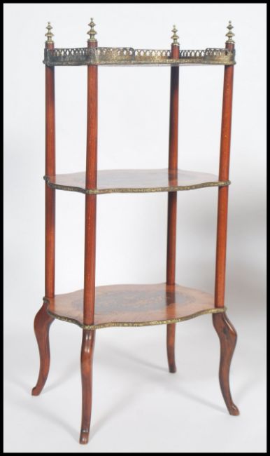 A 19th century walnut three tier etagere raised on splayed feet with ormolu gallery and edges with gilt finials, each tier having a stencil inlay.