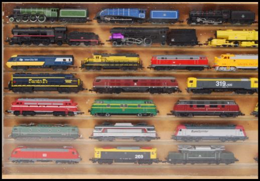 A large wooden display case containing ' N ' gauge model railway locomotives (plastic, non functioning) with various liveries to include; Intercity, Union Pacific, Eurosprinter, Fret etc, Sealed in display case. Measures approx 62cm wide.
