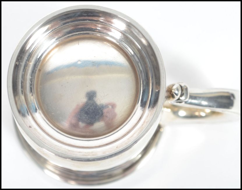 A 20th century silver hallmarked christening cup tankard of plain form raised on a circular foot with shaped handle. Hallmarked for Birmingham 1922 date letter X makers William Neale & Son. Weighs 84.4 grams and measures 8cms high.