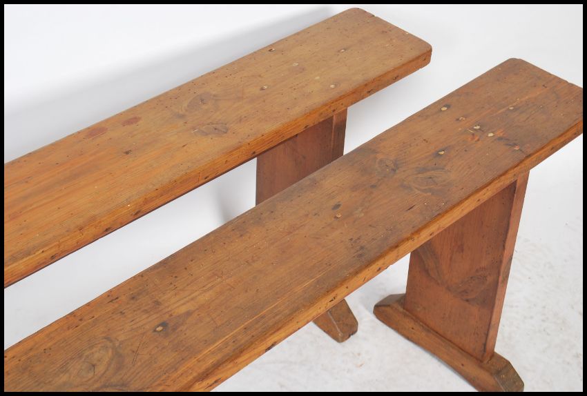 A pair of 19th century French refectory pig benches. Each with shaped single plant tops of pine construction being raised on shaped supports. Measures: 28cm high x 39cm wide.