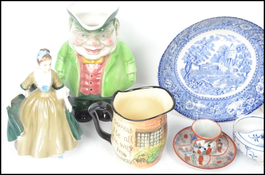 A collection of ceramics dating from the 19th century to include a Toby Jug, Japanese cup and saucer, Royal Artillery tankard, Royal Doulton Gaffer Jug, Royal Doulton Elegance figure, over sized blue and white cup and saucer etc. Highest measures 22 cm.